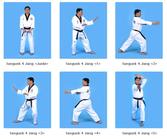 Taegeuk 4 Jang symbolise le » Jin « , l’un des 8 Kwaes (signes divinatoires), qui représente le tonnerre et qui signifie une grande puissance et la dignité. Les nouvelles techniques introduites sont : sonnal momtong maki, pyonsonkeut seo jireugi, je bi poom mok chigi, yop chagi, momtong bakkat maki, deungjumeok eulgul ap chigi, Il est caractérisé par différents mouvements ayant pour objectifs de préparer le pratiquant au Kyorugi. Ce poomsae s’adresse aux pratiquants de 5e Kup (ceinture bleue).